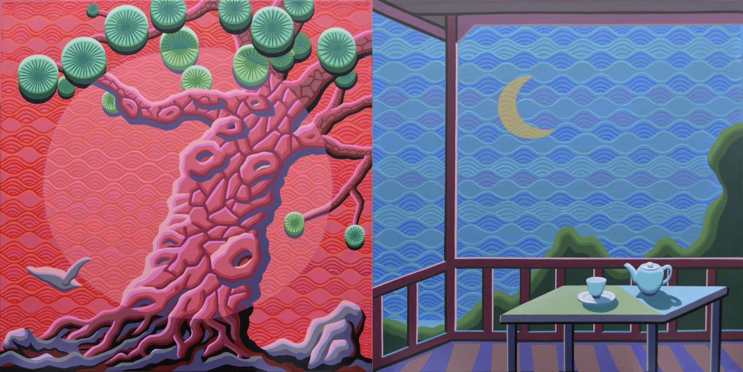 My Day and Night (diptych) explores how perspective reshapes seeing and imagining. Bridging Eastern and Western traditions, the work reinterprets landscapes of China and Australia by reversing traditional Chinese low-relief carving into contemporary Australian landscape painting. I use paint brushes to “carve” the painted surface, creating decorative lines, patterns, and shadows that evoke lacquer relief landscapes. Infused with the vivid colour and flatness of Pop Art, each painting becomes both carving and surface. In Day, sunrise, waves and dolphins suggest hope, while pine trees symbolize steadfastness, self-discipline, and endurance. In Night, after guests depart, moonlight pools on the deck and the blue sky settles like water. Together, the diptych meditates on belonging, memory, and transformation, inviting viewers to experience the world through shifting horizons.